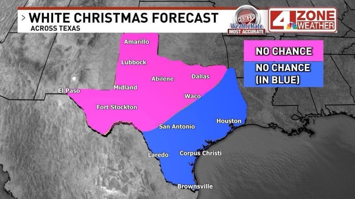 Как известно, Техас большой штат и расположен на юге, поэтому снежная погода здесь редкость и зачастую вообще стихийное бедствие. Поэтому вот вам немного техасского юмора! (Перевод: Прогноз Снежного Рождества – нет шансов и нет шансов, но синим) 😁