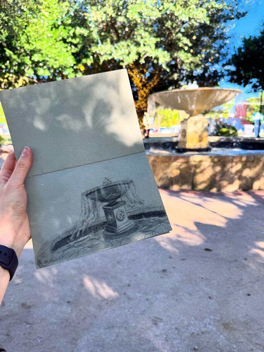 С погодой очень повезло в этот раз! На солнце конечно было жарко, но в тени самое то. Поэтому после обеда я отправилась обратно в парк на одну из лавочек у фонтана. И чтобы не сидеть без дела пока организаторы подводили итоги конкурса, я нарисовала фонтан карандашом. Мне кажется наибольшее удовольствие я получаю от рисования воды.