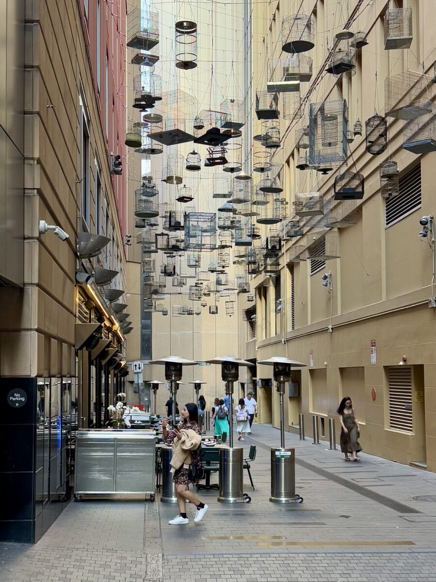 Что-то я похоже не сняла тот ивент с цветами, так что вот инсталляция из птичьих клеток возле сиднейского мьюзик холла, женщина-мозаика из соседнего ресторана, которая всегда смотрит на зрителя и немного цветов жакаранды.